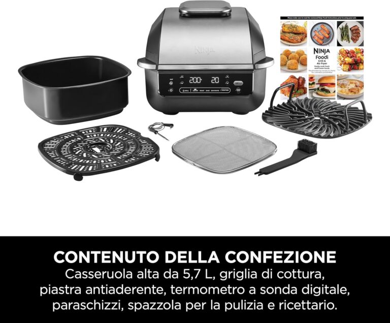 La Ninja Griglia e Friggitrice ad Aria EG351EU è un elettrodomestico 5 in 1 che combina griglia ad alta temperatura e air fryer in un unico dispositivo compatto. Con capacità 5,7 L e termometro digitale integrato, garantisce cotture precise, veloci…