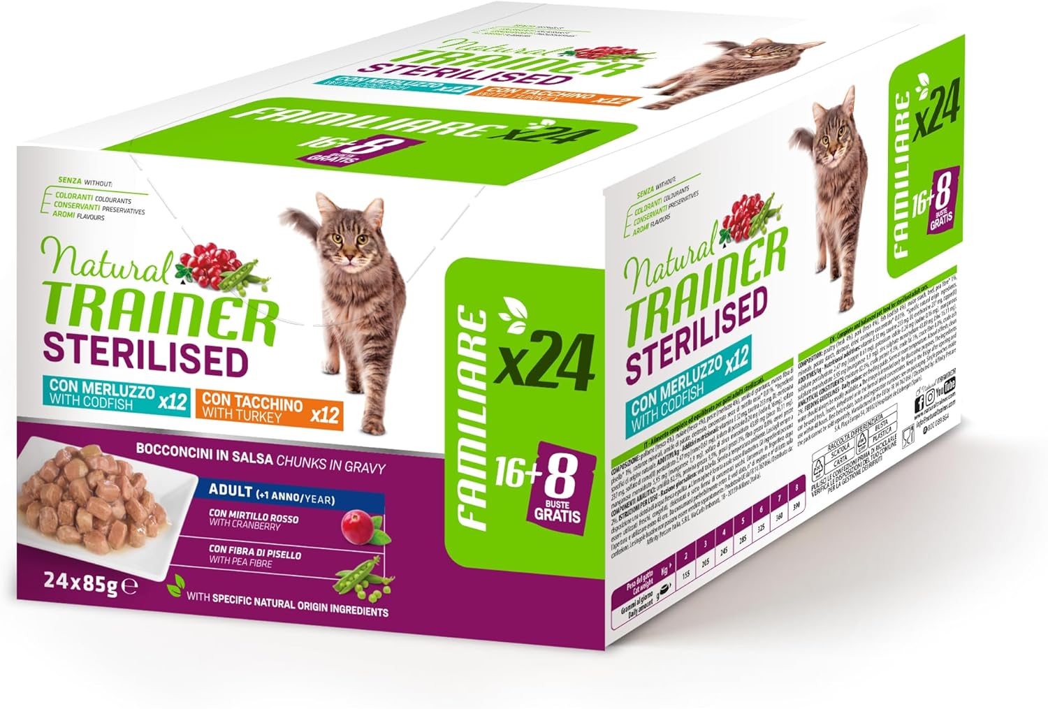 Il Natural Trainer cibo umido per gatti adulti sterilizzati è un alimento completo progettato per soddisfare le esigenze nutrizionali dei gatti dopo la sterilizzazione. Il multipack include 24 bustine da 85 g, con due gusti appetitosi: Tacchino e Merluzzo.